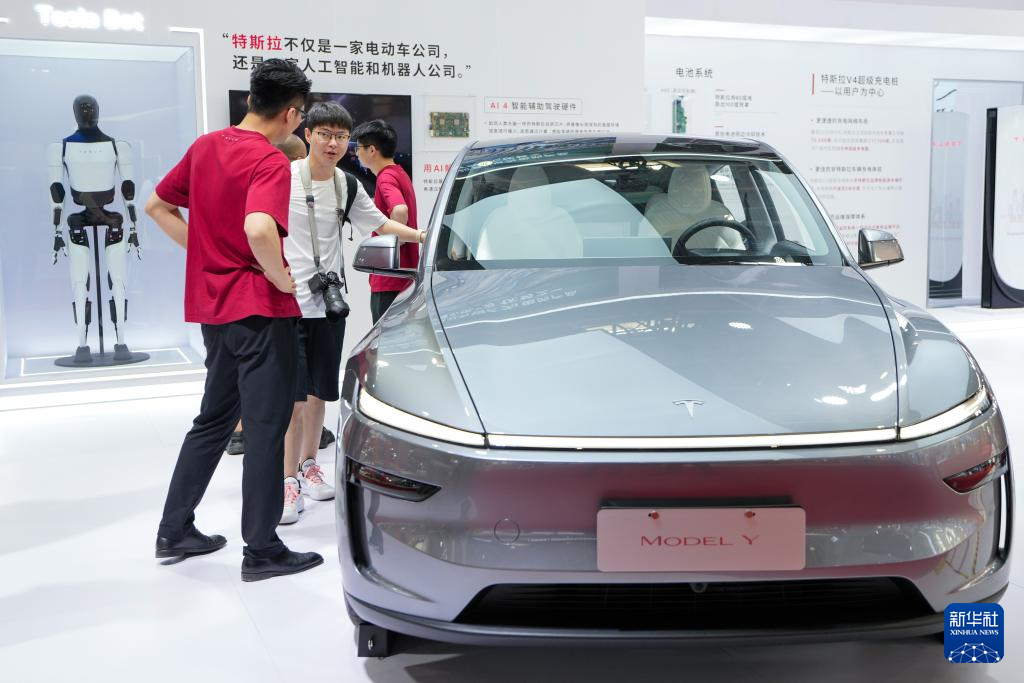 7月19日,在智能汽車鏈展區,參觀者在了解一款特斯拉電動汽車。