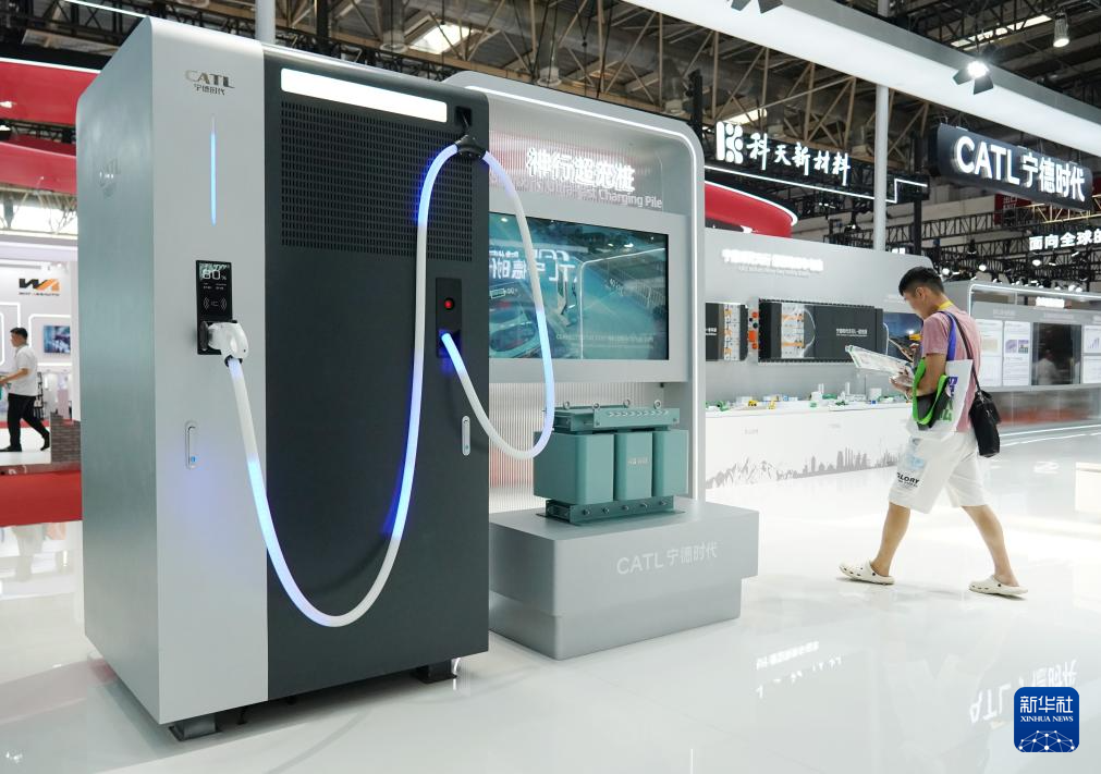 這是7月18日在智能汽車鏈展區寧德時代展臺拍攝的神行超充樁。