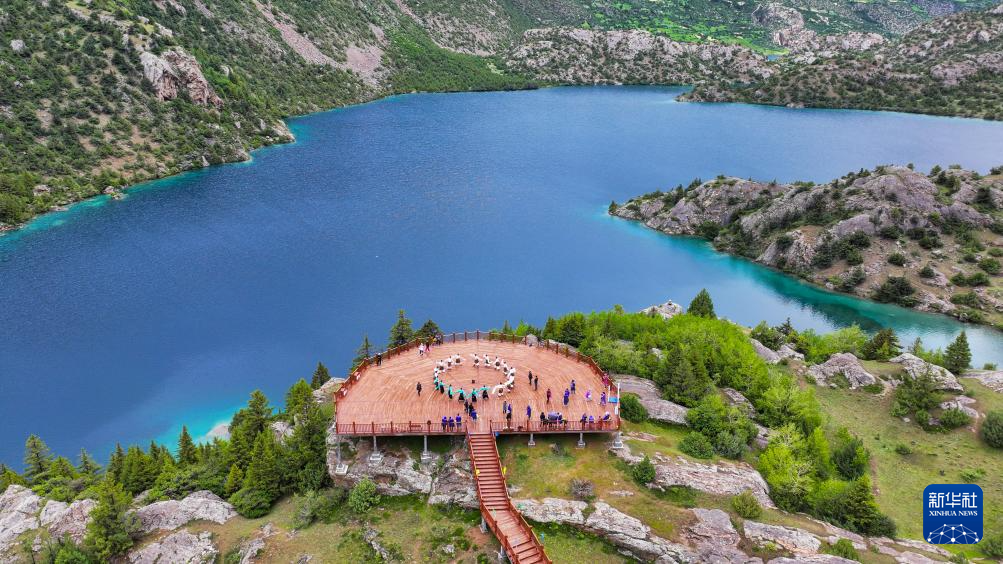 邊壩縣普玉一村的文藝隊演員在“三色湖”觀景臺上為游客表演鍋莊(7月20日攝,無人機照片)。