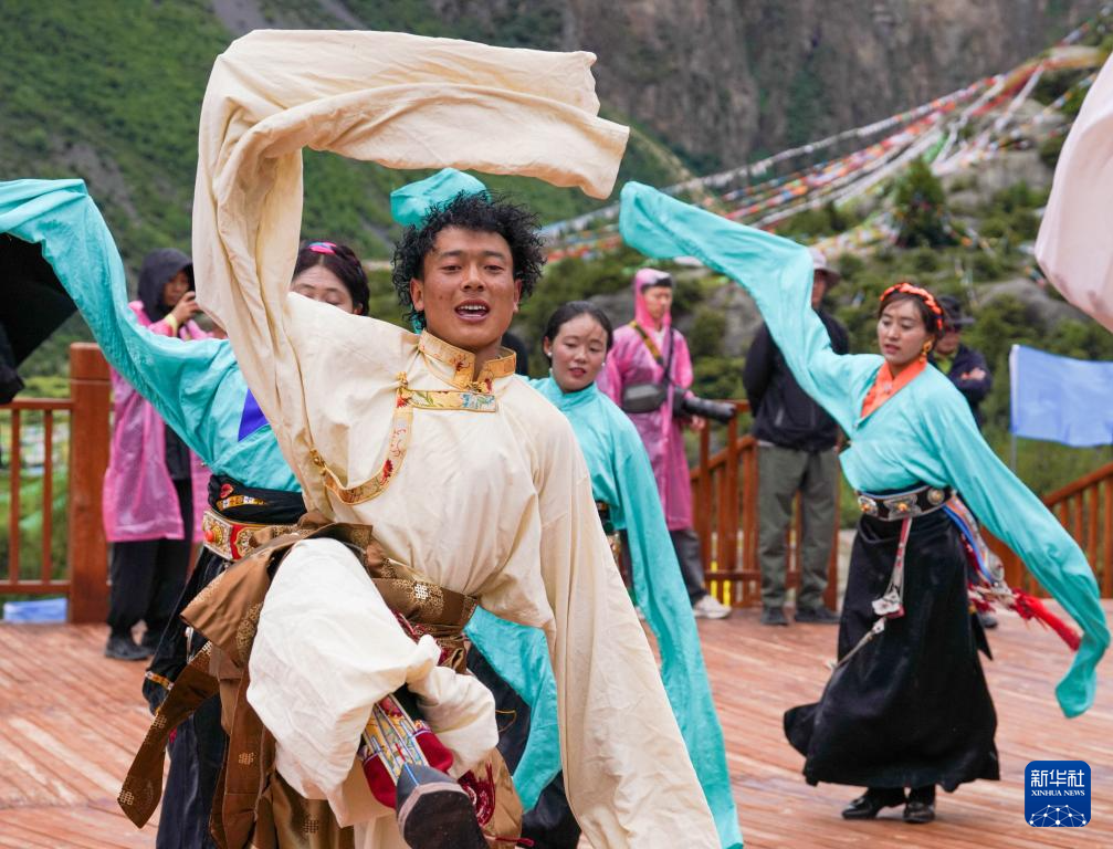 邊壩縣普玉一村的文藝隊演員在“三色湖”觀景臺上為游客表演鍋莊(7月20日攝)。