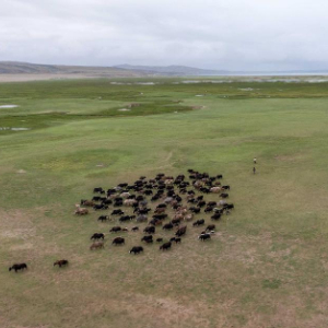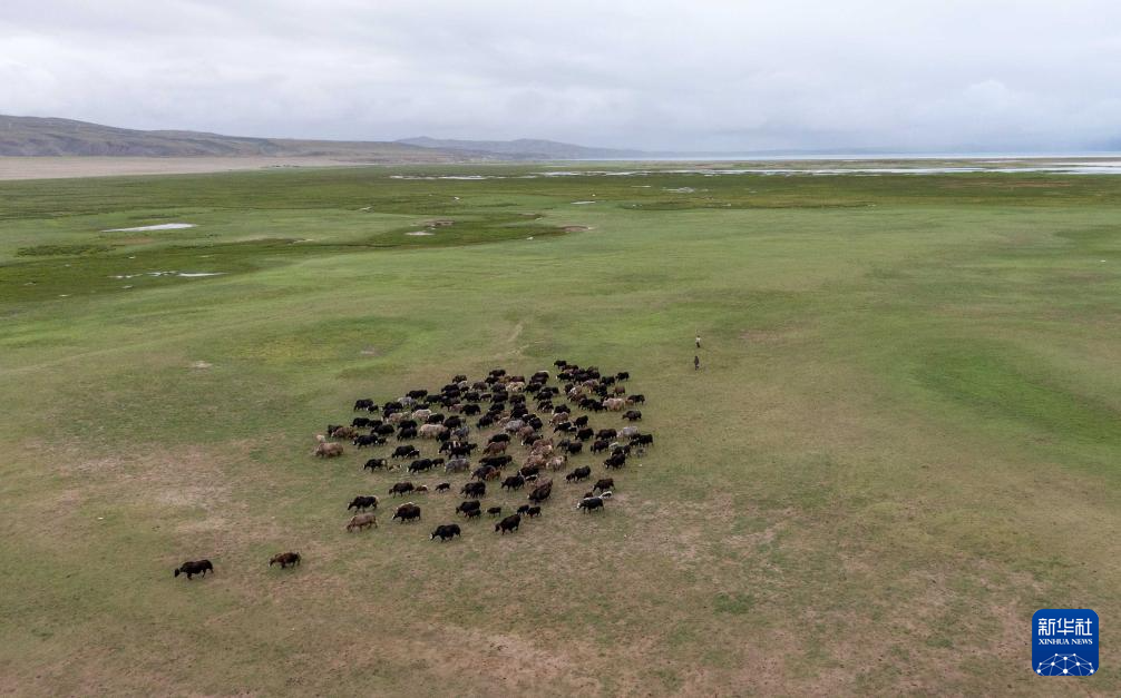 7月22日拍攝的瑪旁雍錯濕地上的牦牛(無人機照片)。