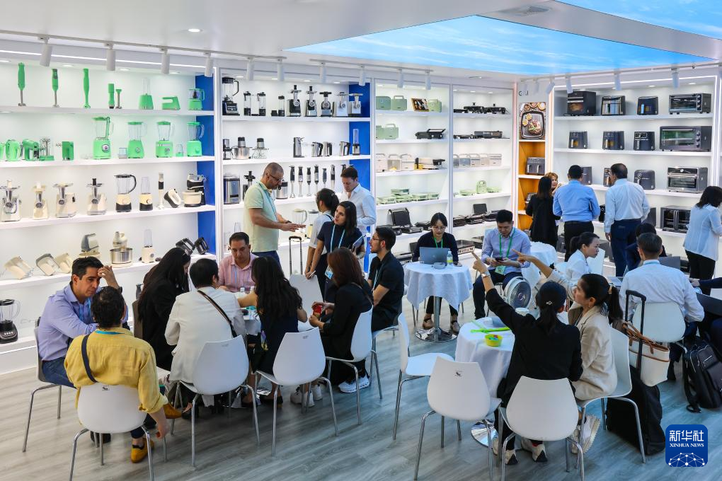 客戶在新寶股份出口小家電展廳了解產品信息(7月24日攝)。