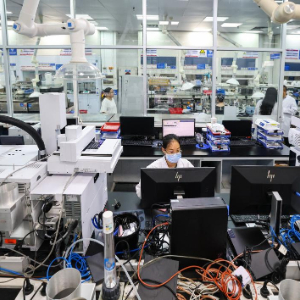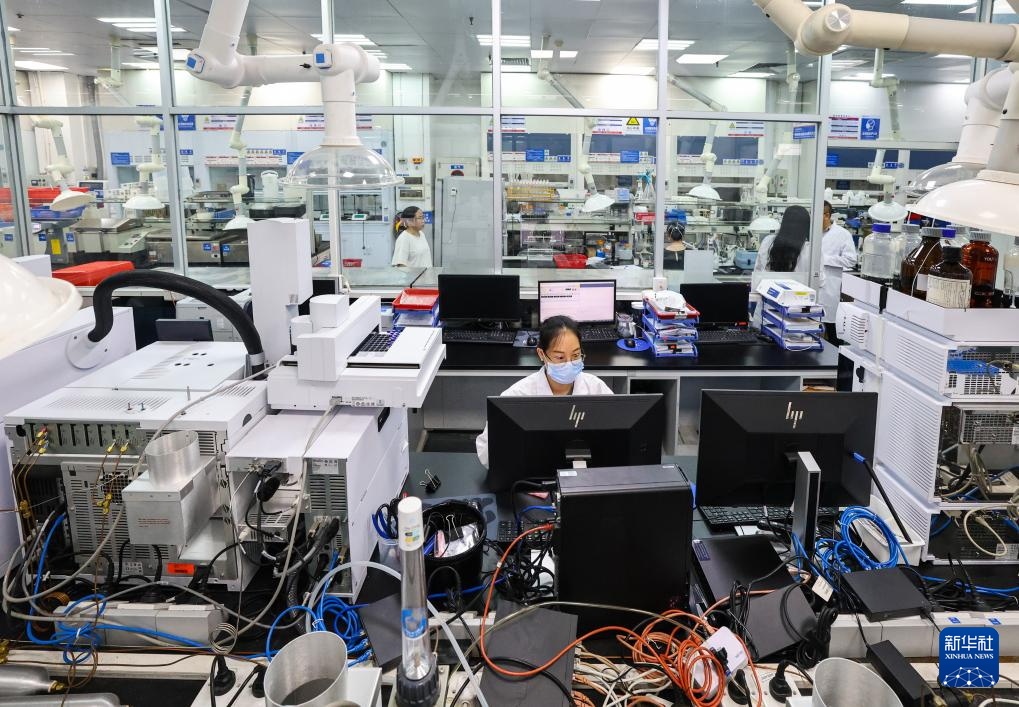 技術人員在新寶股份認證測試中心進行理化測試(7月24日攝)。