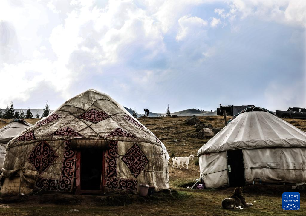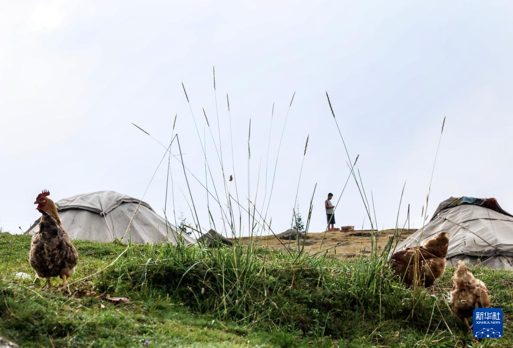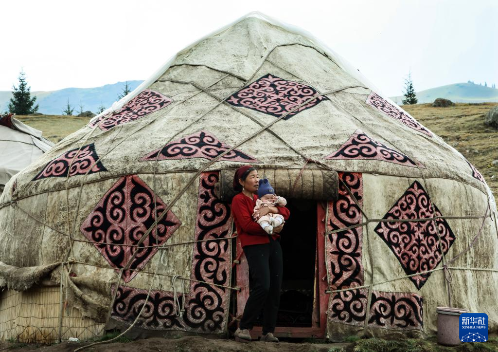 7月29日,一位牧民抱著孩子在氈房門口張望。