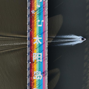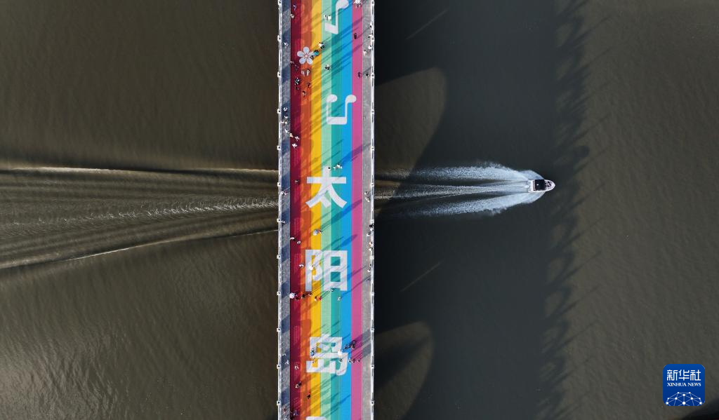 7月27日,一艘船駛過通往太陽島風景區的“彩虹橋”(無人機照片)。