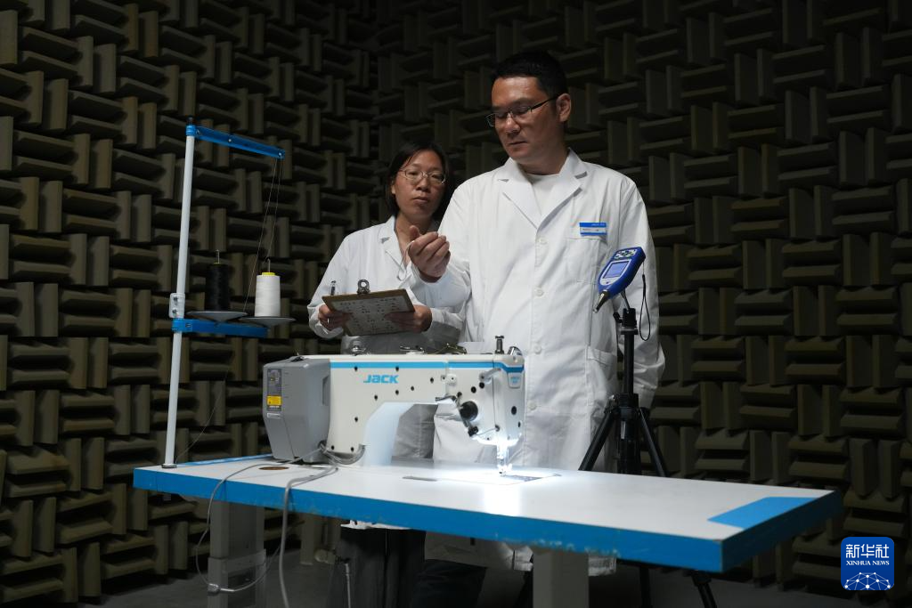 7月17日,在位于臺州的杰克科技股份有限公司總部,實驗室工程師在半消音室檢測智能縫紉機噪聲。