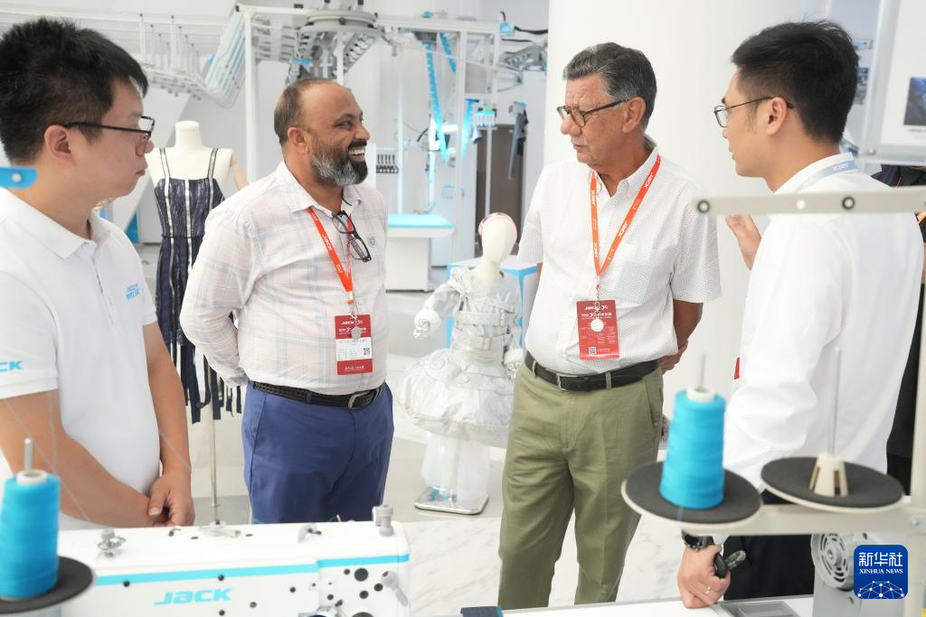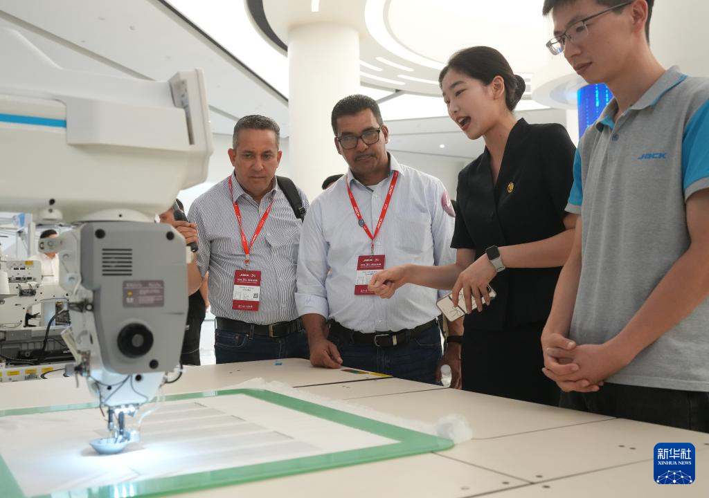 7月18日,在位于臺州的杰克科技股份有限公司總部,工作人員向外籍客商介紹公司的智能縫紉設備。