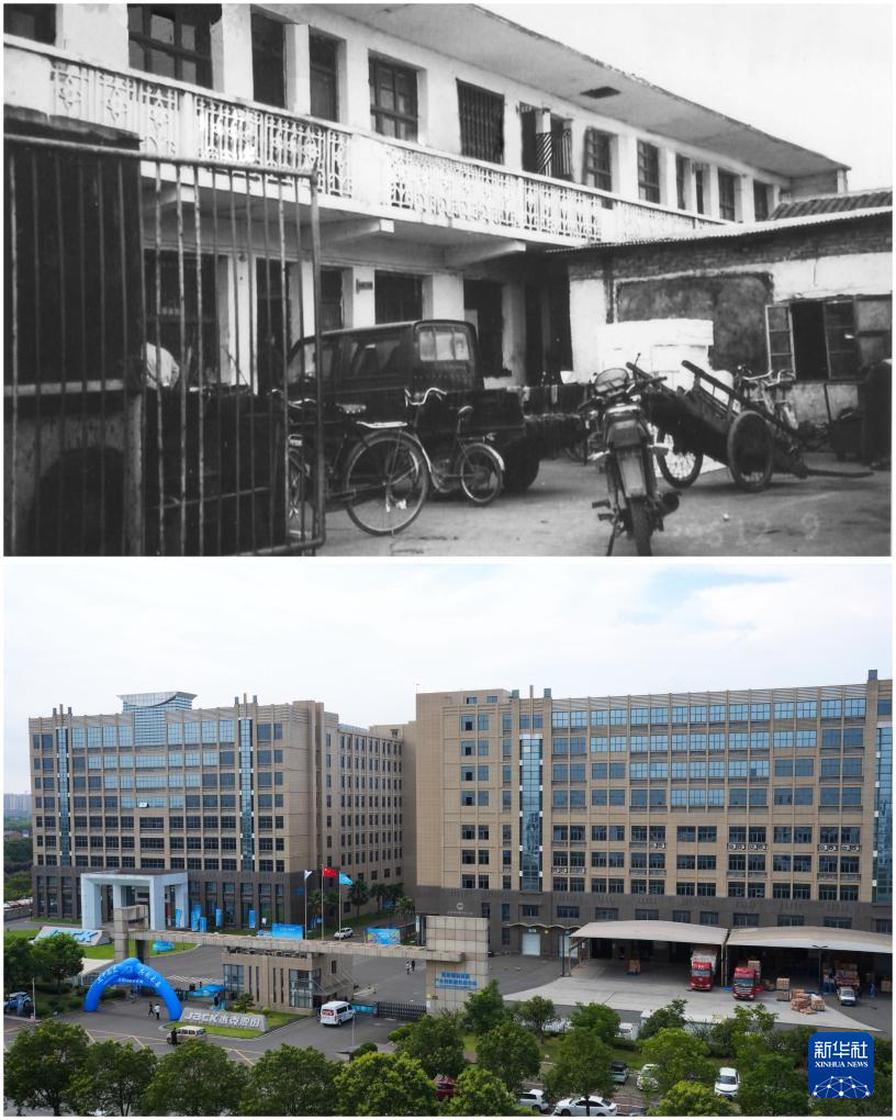 這是一張拼版照片。上圖為:1995年杰克創立時的廠區景象(資料照片);下圖為:杰克科技股份有限公司總部的外景(2025年7月17日攝,新華社記者翁忻旸攝)。