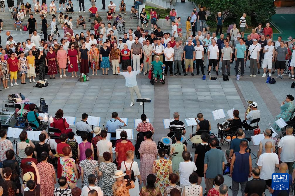 7月25日,在哈爾濱市松花江畔,民間合唱團的演唱吸引人們駐欣賞(無人機照片)。