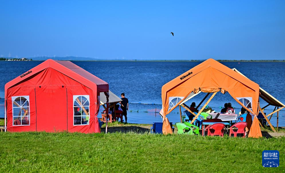 人們在哈爾濱市松花江畔的帳篷中消暑休閑(7月6日攝,無人機照片)。
