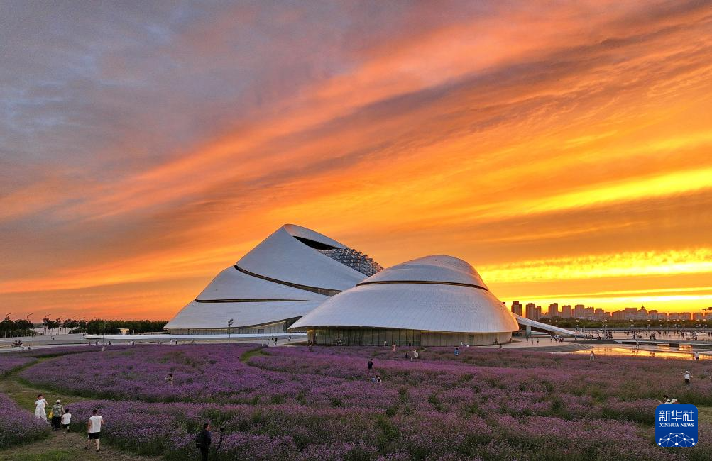 7月20日,在哈爾濱大劇院附近,人們在絢爛晚霞中游玩拍照(無人機照片)。