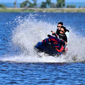 松花江哈爾濱段一處江面,游客在體驗摩托艇項目(7月6日攝)。