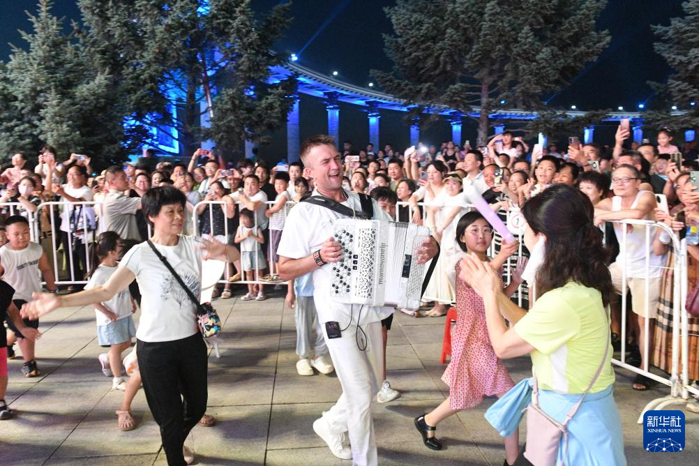 7月22日,在哈爾濱市防洪紀念塔廣場,游客與來自俄羅斯的手風琴手互動。