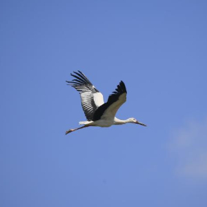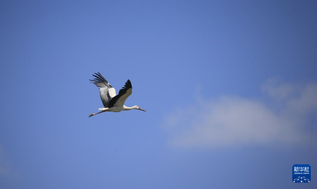 8月8日,哈爾濱市林業和草原局成功救治的國家一級保護動物東方白鸛展翅翱翔在藍天白云間。