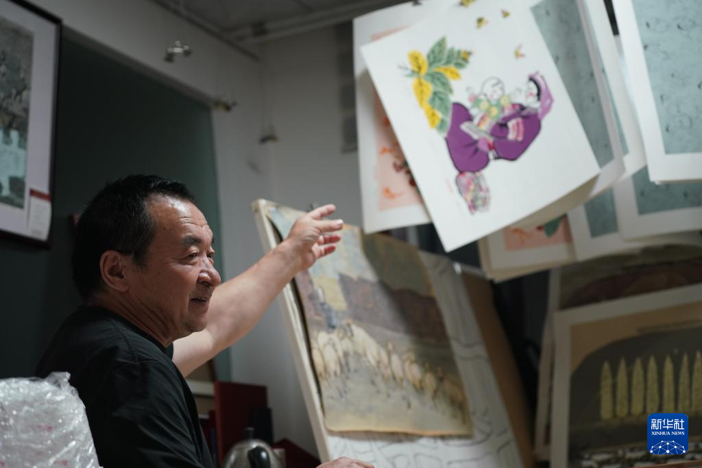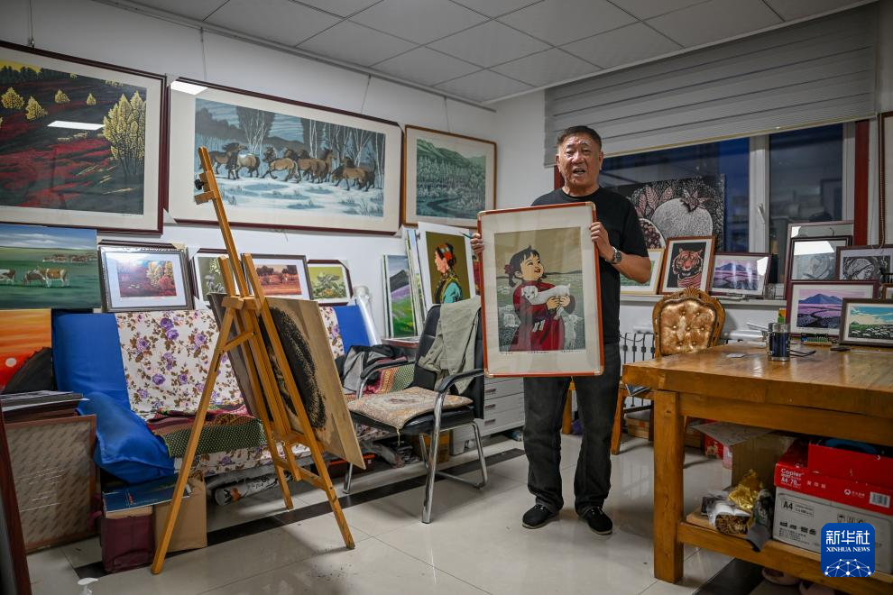 8月10日,在內蒙古扎魯特旗版畫院,扎魯特版畫代表性傳承人照那木拉展示自己的作品。
