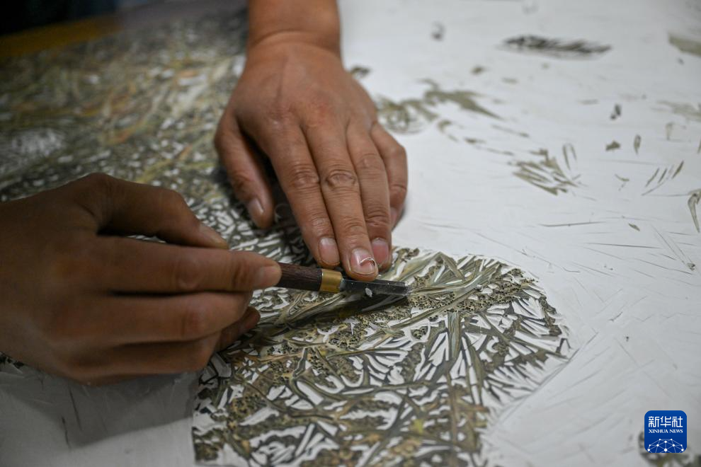 8月10日,在內蒙古扎魯特旗版畫院,青年畫家石芳宇在創作版畫。