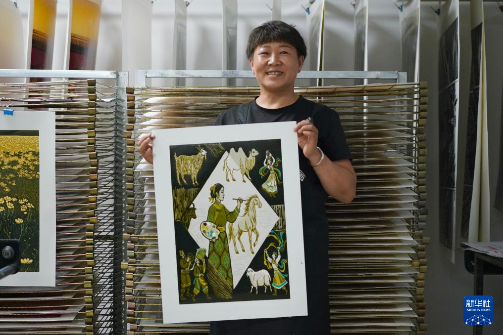8月10日,在內蒙古扎魯特旗版畫院,畫家陳其木格展示她的版畫作品《草原藝韻》。