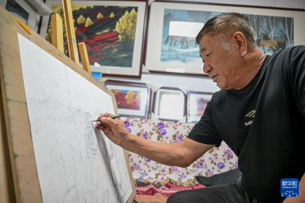 8月10日,在內蒙古扎魯特旗版畫院,扎魯特版畫代表性傳承人照那木拉在畫室創作。