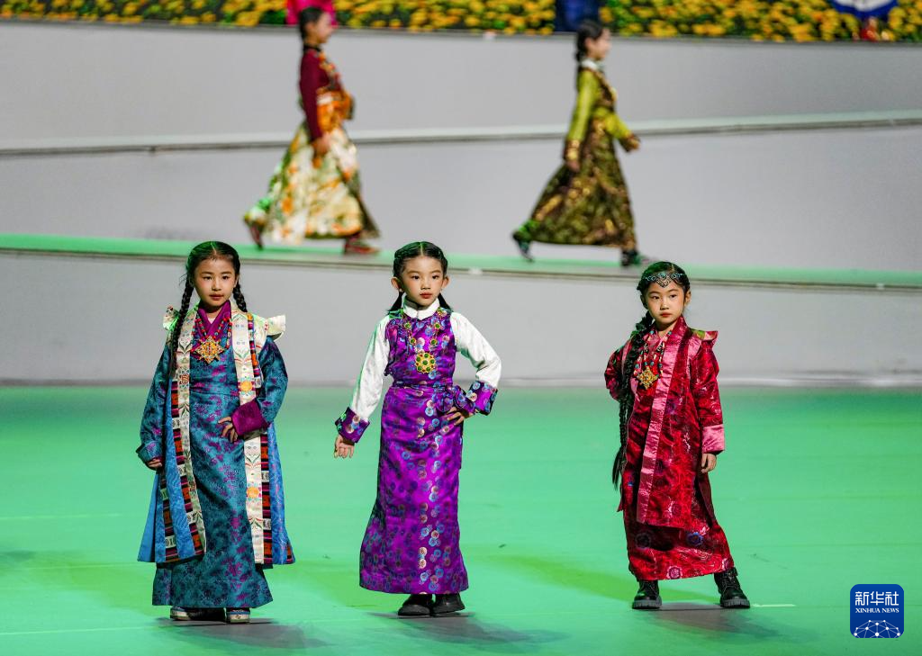 在首屆西藏“衣脈相承”服飾文化周上,小朋友在展示各式藏裝(2025年1月5日攝)。