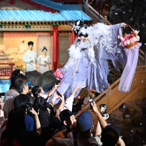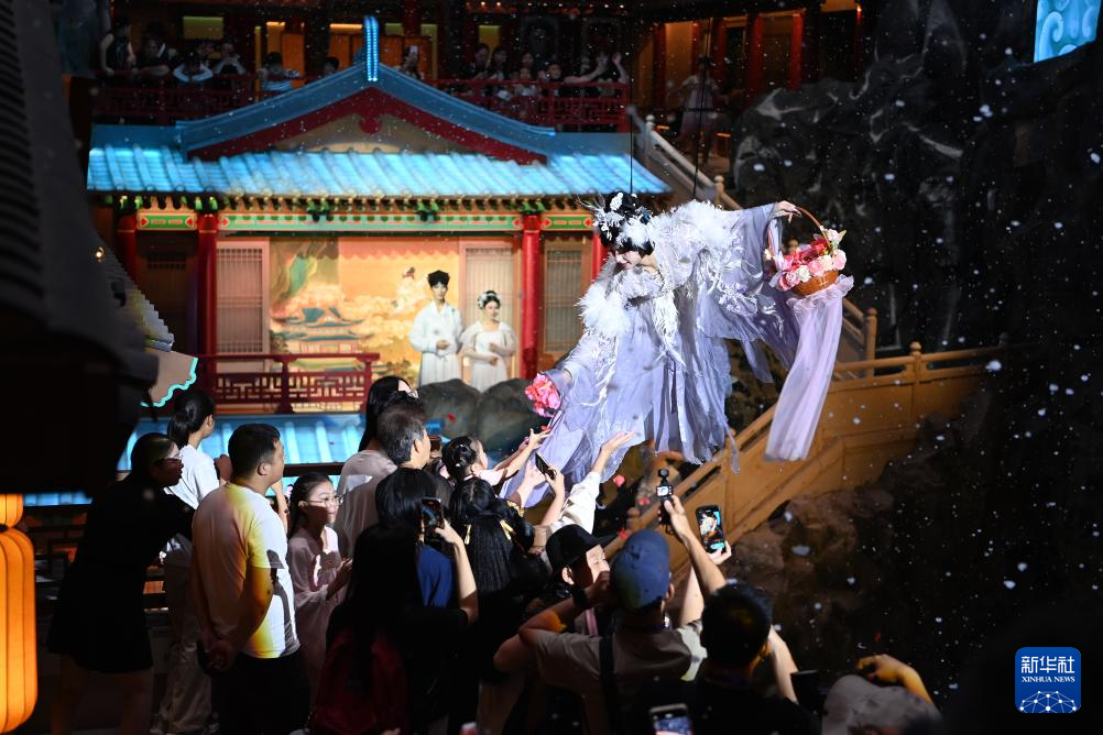 8月22日,在位于廈門東渡郵輪母港片區的閩南文化主題景區“嶼見閩南·時光幻境”,“白鷺女神”與觀眾互動。