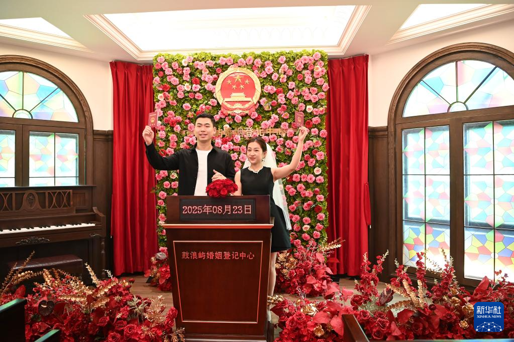 8月23日,一對新人在鼓浪嶼婚姻登記中心拍照留念。