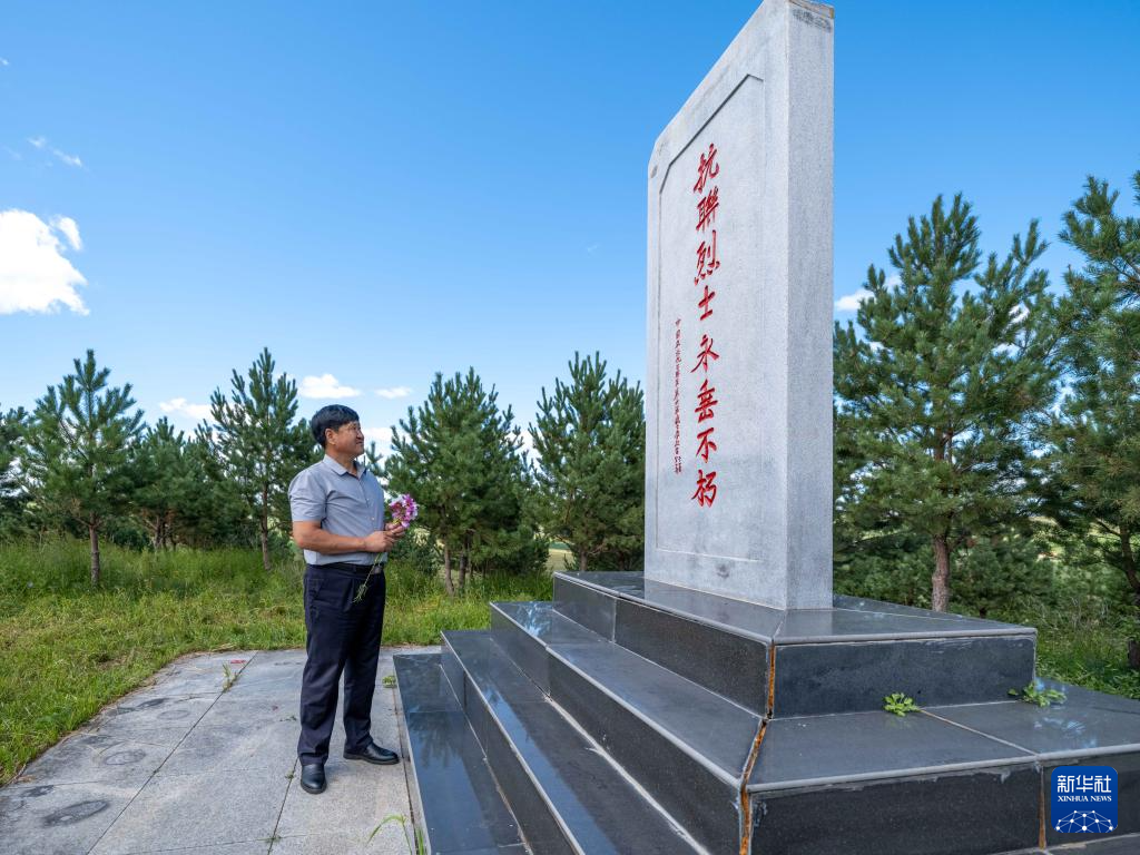 8月23日,內蒙古呼倫貝爾市阿榮旗六合鎮,孫福貴在“紅軍崗”上為抗聯烈士紀念碑獻花。