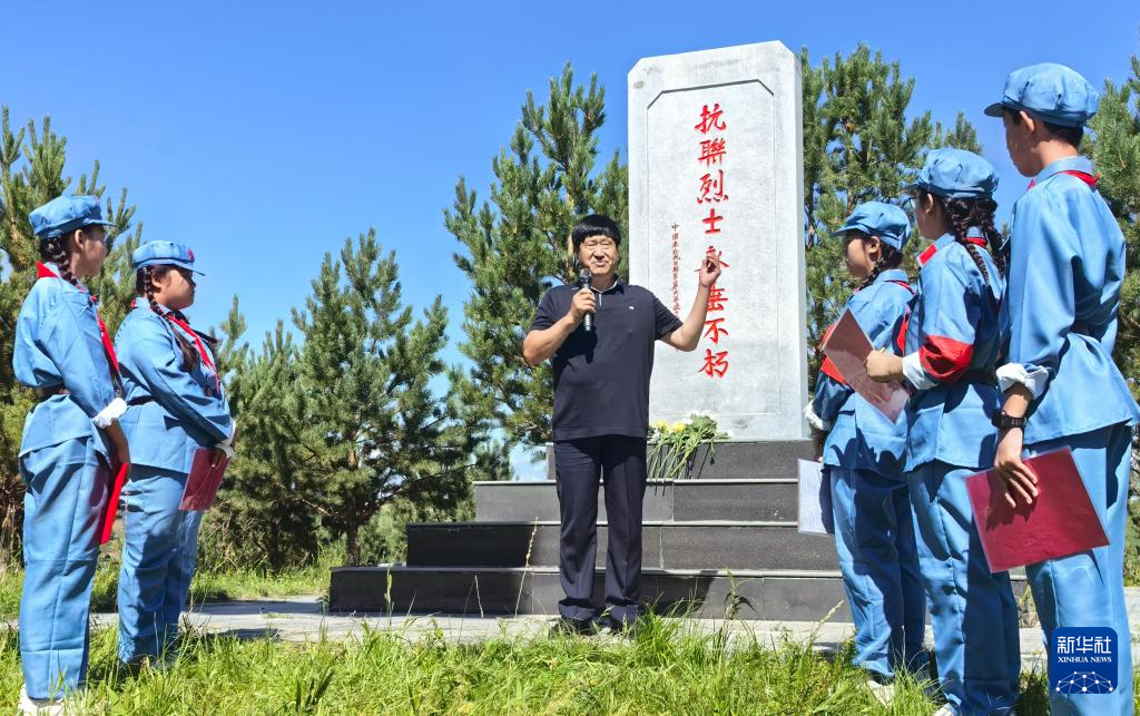8月14日,內蒙古呼倫貝爾市阿榮旗六合鎮,孫福貴(中)在“紅軍崗”上向參加“重走抗聯路”活動的學生講述東北抗聯的事跡。