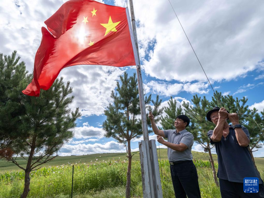 8月23日,內蒙古呼倫貝爾市阿榮旗六合鎮,孫福貴(左)與村民李洪海在“紅軍崗”上升旗。