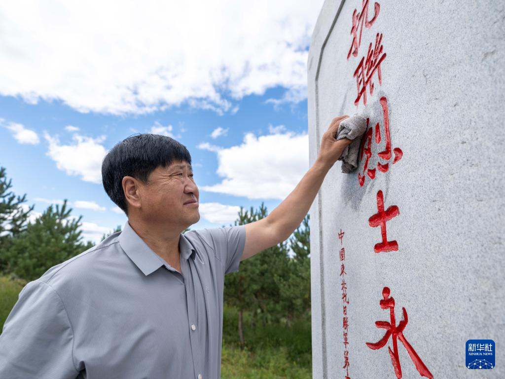 8月23日,內蒙古呼倫貝爾市阿榮旗六合鎮,孫福貴在“紅軍崗”上擦拭東北抗聯烈士紀念碑。
