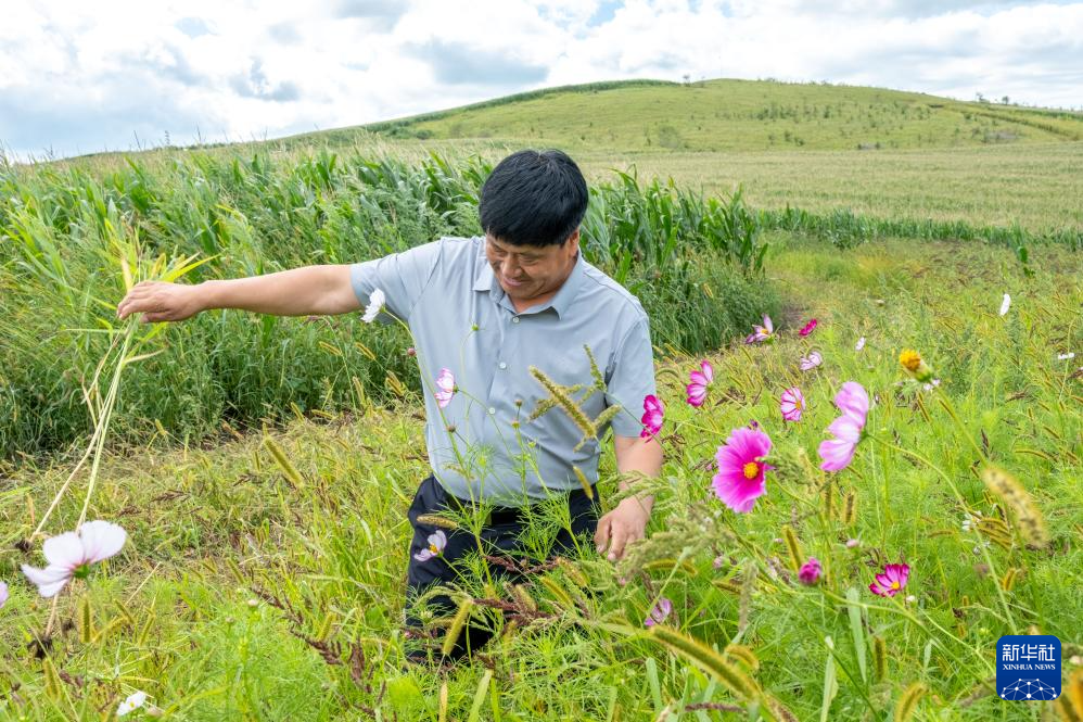8月23日,內蒙古呼倫貝爾市阿榮旗六合鎮,孫福貴在“紅軍崗”上打理他為烈士墓園種植的格?;?。