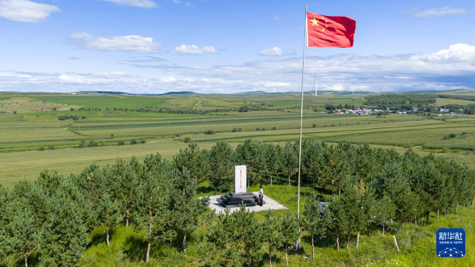 8月23日,內蒙古呼倫貝爾市阿榮旗六合鎮,孫福貴在“紅軍崗”上緬懷犧牲在此的東北抗聯先烈(無人機照片)。