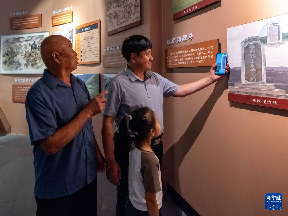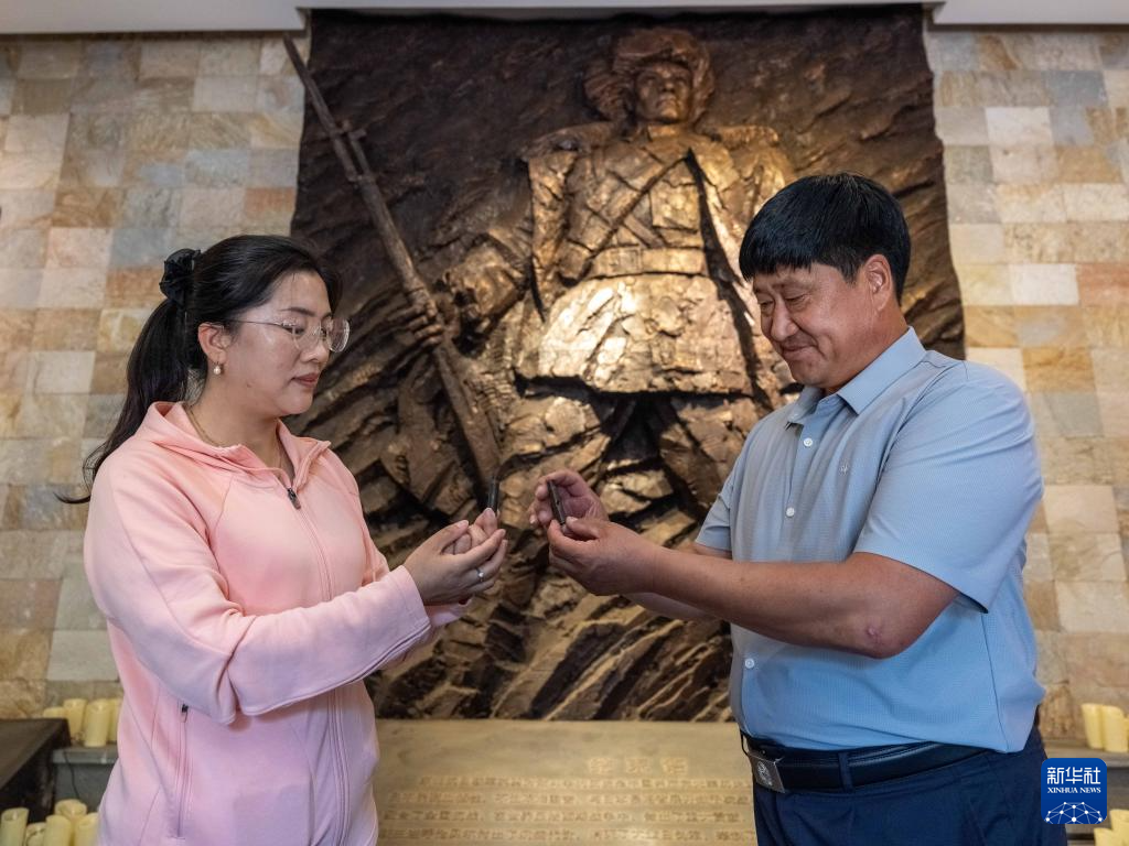 8月23日,內蒙古呼倫貝爾市阿榮旗,孫福貴(右)在呼倫貝爾東北抗聯紀念館中向家人展示由他粉刷的老紀念碑。
