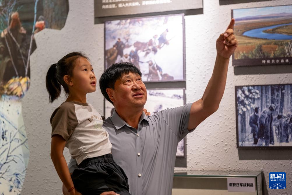 8月23日,內蒙古呼倫貝爾市阿榮旗,孫福貴在呼倫貝爾東北抗聯紀念館向孫女講述東北抗聯在呼倫貝爾地區進行敵后游擊的事跡。