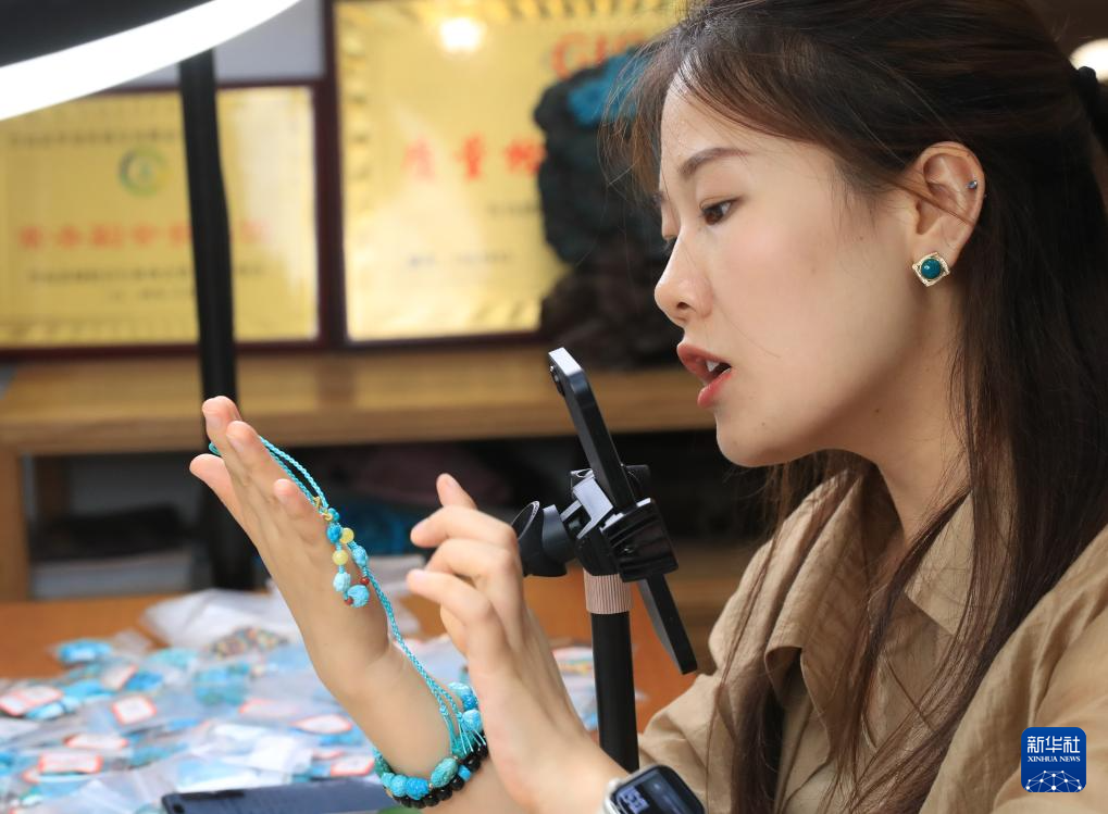 8月30日,一位主播在湖北省竹山縣為綠松石產品做直播。