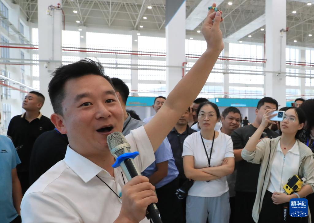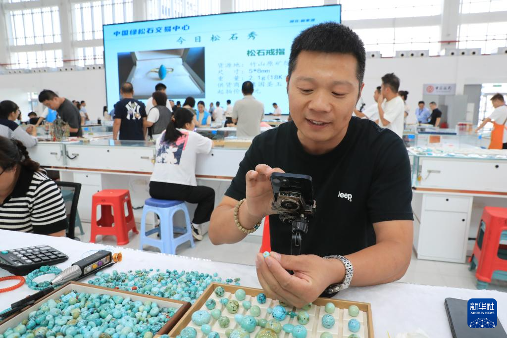 8月30日,工作人員在湖北省竹山縣中國綠松石交易中心舉行的“今日松石秀”活動上主持拍賣綠松石產品。