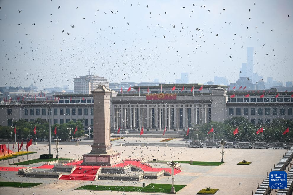 9月3日,紀念中國人民抗日戰爭暨世界反法西斯戰爭勝利80周年大會在北京隆重舉行。這是紀念大會現場放飛和平鴿。