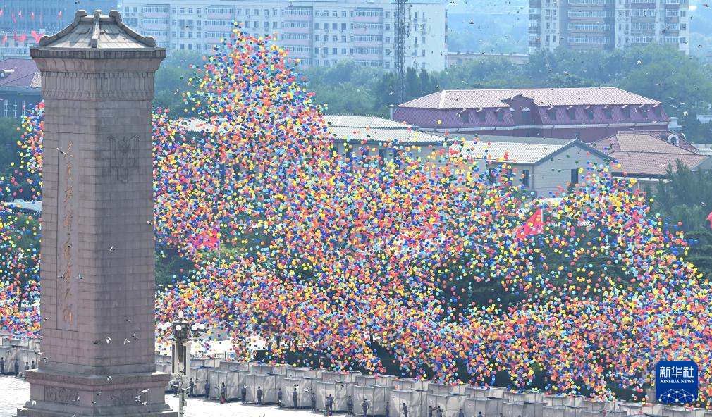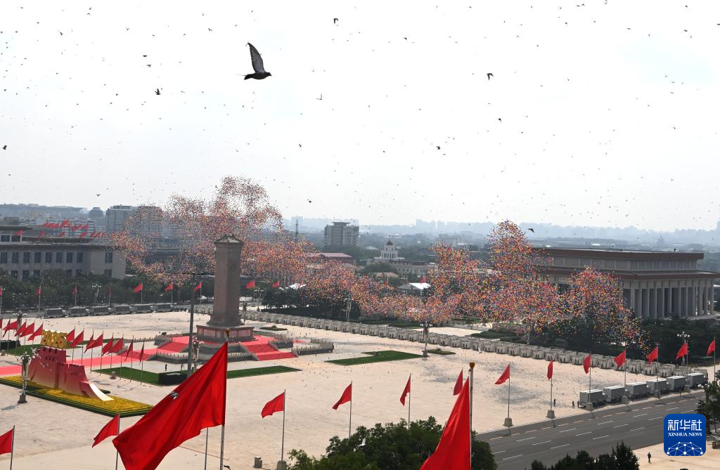 9月3日,紀念中國人民抗日戰爭暨世界反法西斯戰爭勝利80周年大會在北京隆重舉行。這是紀念大會現場放飛和平鴿和氣球。