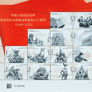 9月3日,中國郵政發行《中國人民抗日戰爭暨世界反法西斯戰爭勝利八十周年》紀念郵票1套13枚、小型張1枚,全套面值為20.8元。