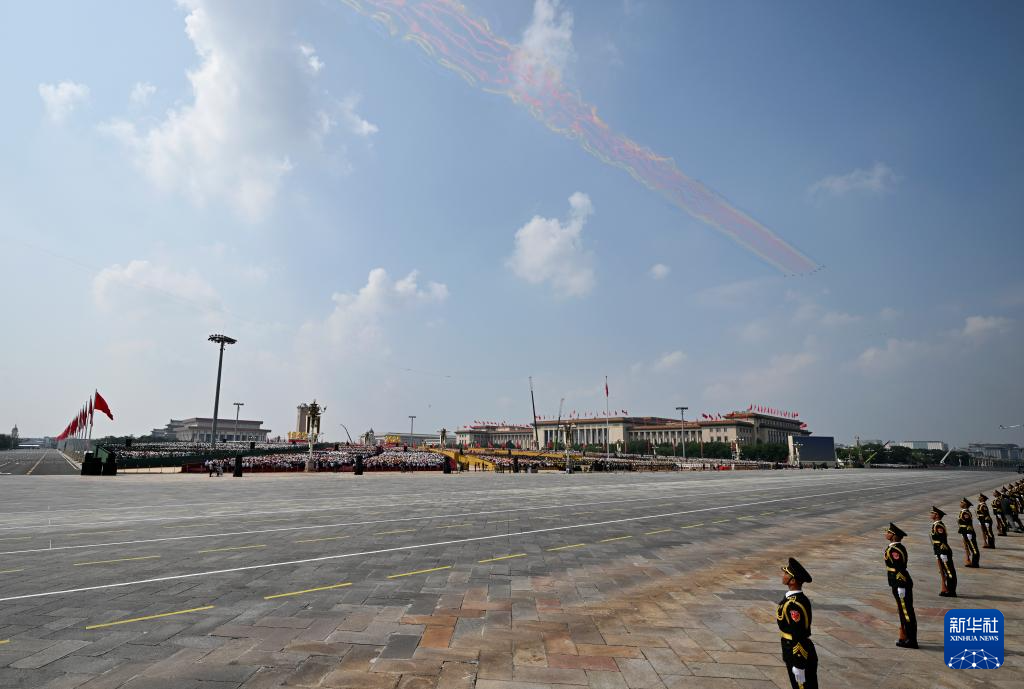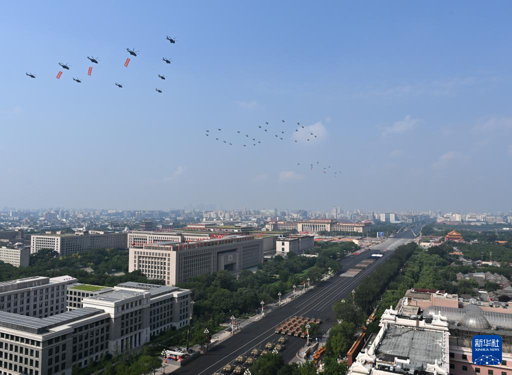 9月3日,紀念中國人民抗日戰爭暨世界反法西斯戰爭勝利80周年大會在北京隆重舉行。這是空中護旗梯隊飛過天安門廣場上空。