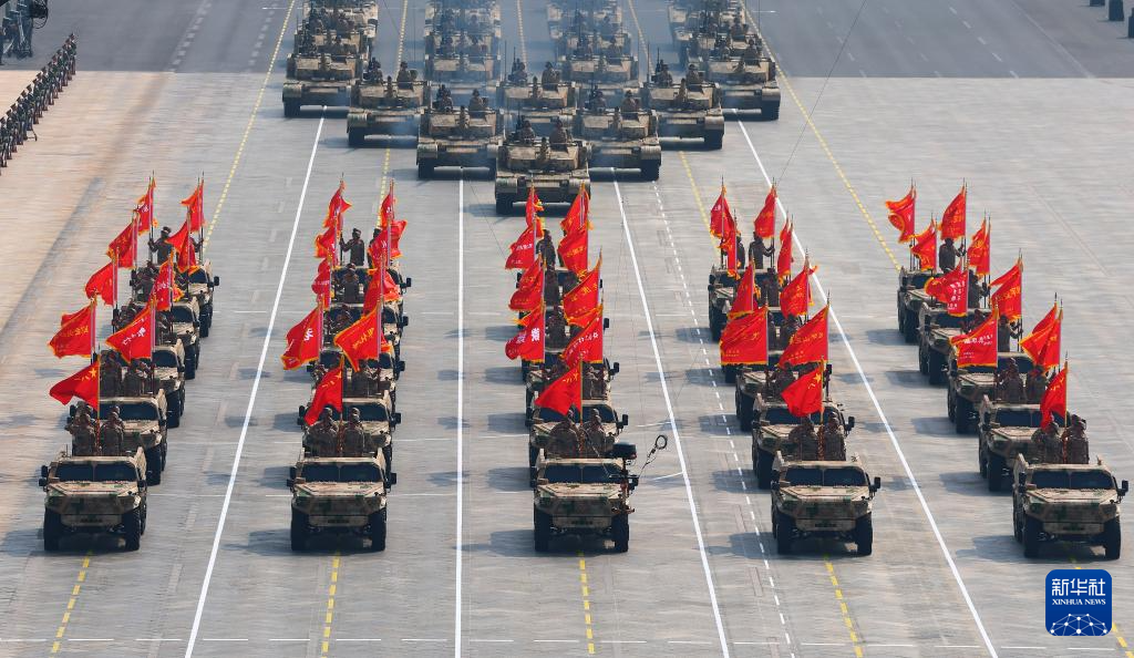 9月3日,紀念中國人民抗日戰爭暨世界反法西斯戰爭勝利80周年大會在北京隆重舉行。這是戰旗方隊和裝備方隊接受檢閱。