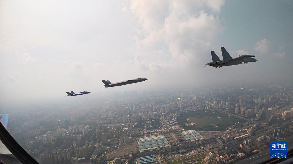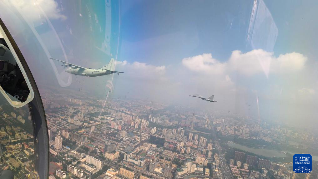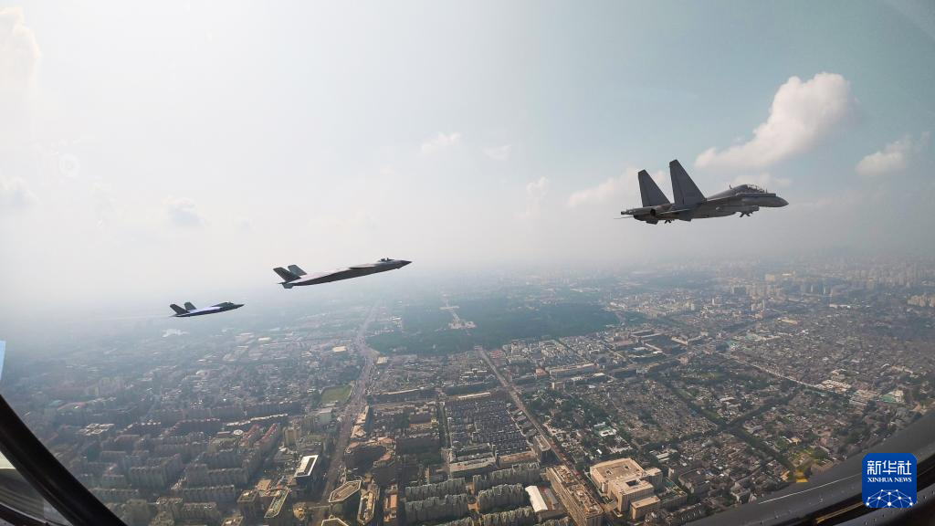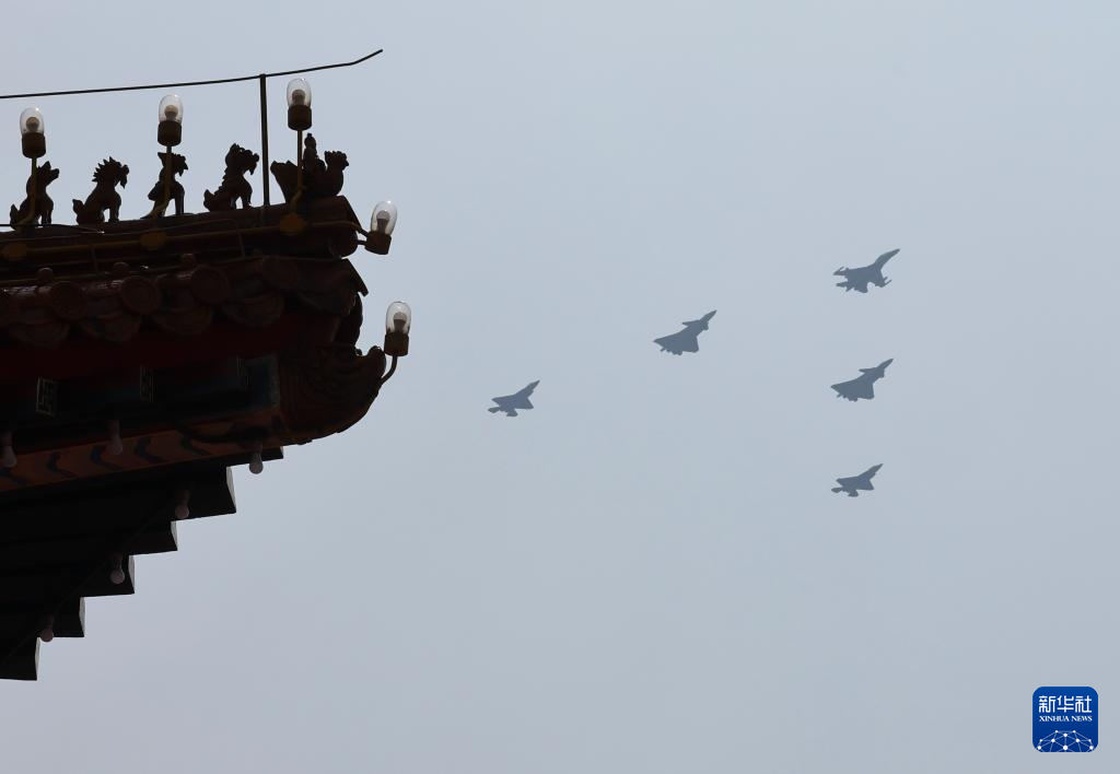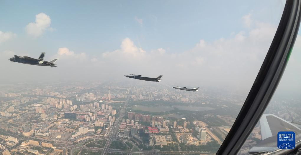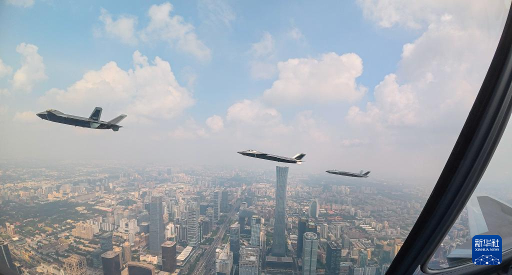 9月3日,紀念中國人民抗日戰爭暨世界反法西斯戰爭勝利80周年大會在北京隆重舉行。這是殲擊機梯隊從北京城區上空飛過。