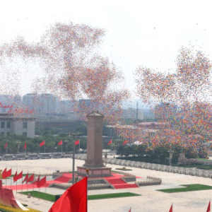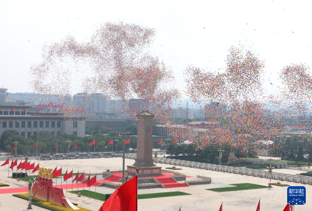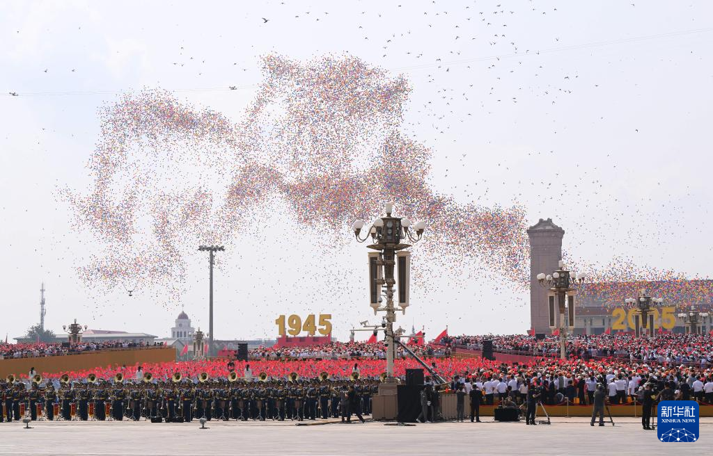 9月3日,紀念中國人民抗日戰爭暨世界反法西斯戰爭勝利80周年大會在北京隆重舉行。這是紀念大會現場放飛和平鴿和氣球。