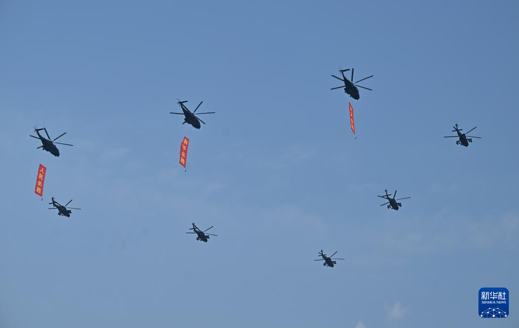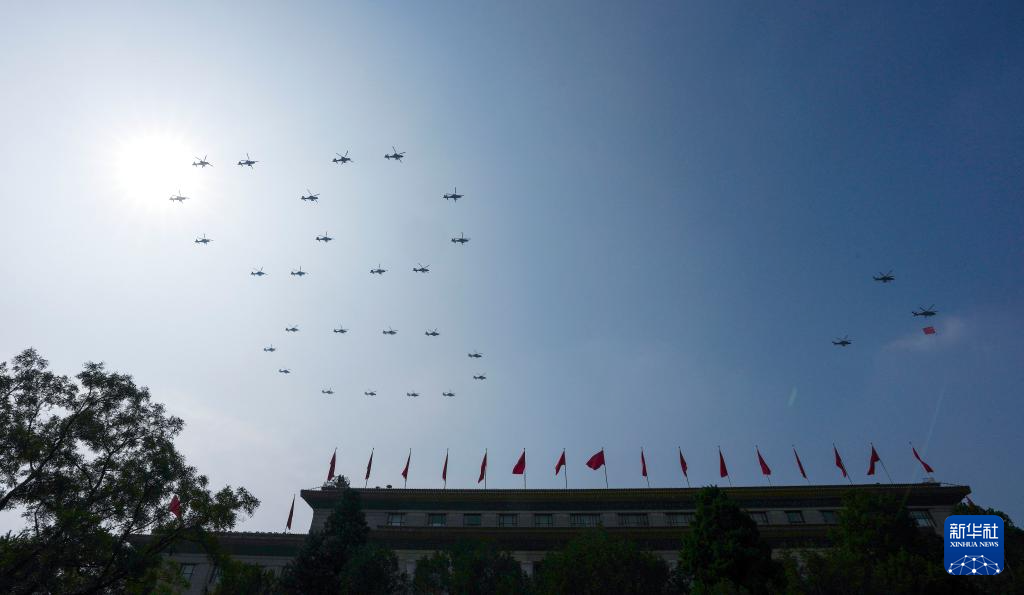 9月3日,紀念中國人民抗日戰爭暨世界反法西斯戰爭勝利80周年大會在北京隆重舉行。這是特種機梯隊從北京城區上空飛過。