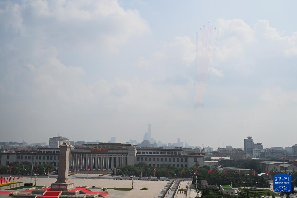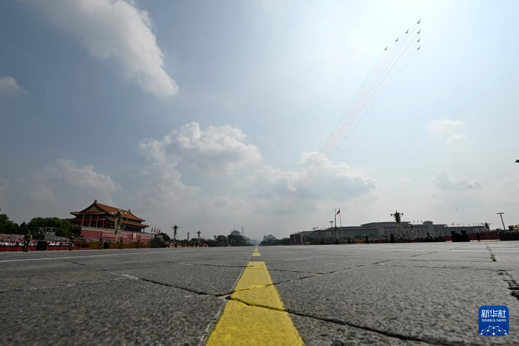 9月3日,紀念中國人民抗日戰爭暨世界反法西斯戰爭勝利80周年大會在北京隆重舉行。這是教練機梯隊飛過天安門廣場上空。