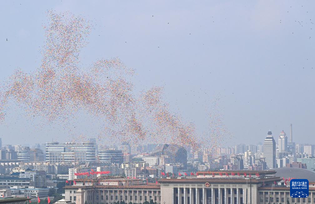 9月3日,紀念中國人民抗日戰爭暨世界反法西斯戰爭勝利80周年大會在北京隆重舉行。這是紀念大會現場放飛氣球。
