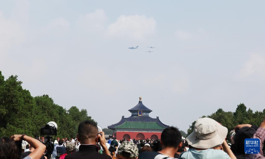 9月3日,紀念中國人民抗日戰爭暨世界反法西斯戰爭勝利80周年大會在北京隆重舉行。這是市民在北京天壇公園觀看加受油機梯隊。