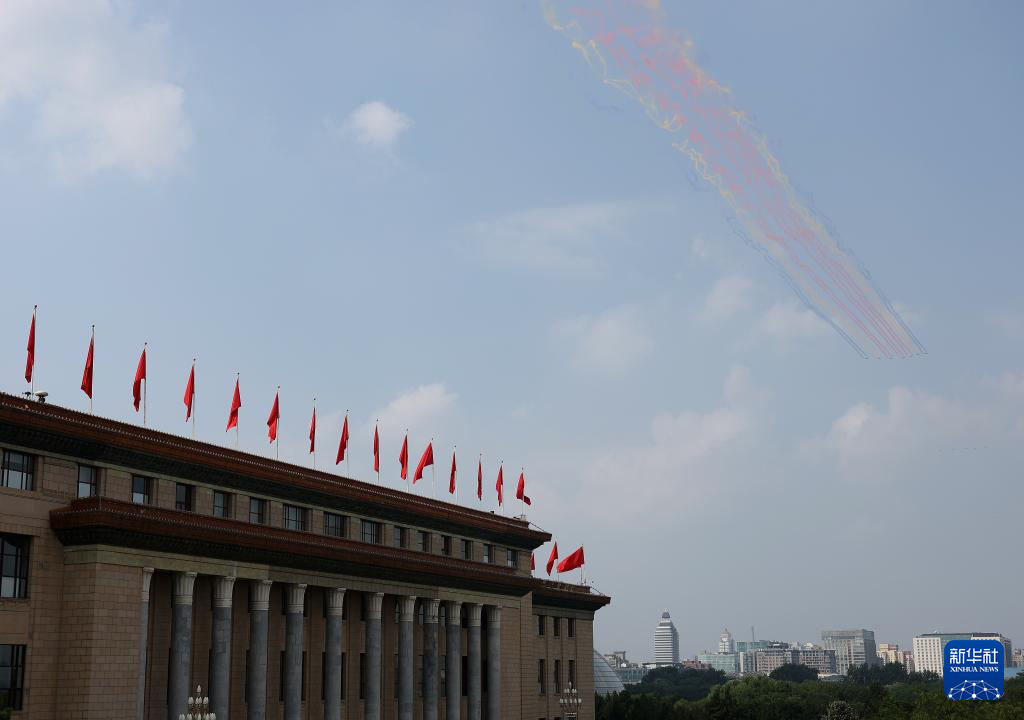 9月3日,紀念中國人民抗日戰爭暨世界反法西斯戰爭勝利80周年大會在北京隆重舉行。這是教練機梯隊飛過天安門廣場上空。