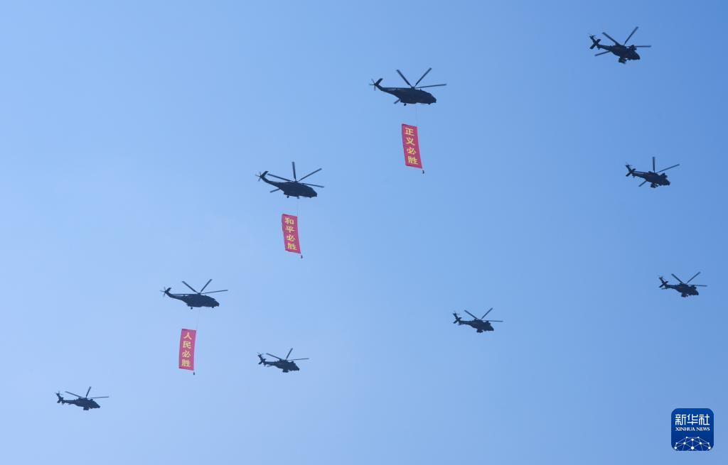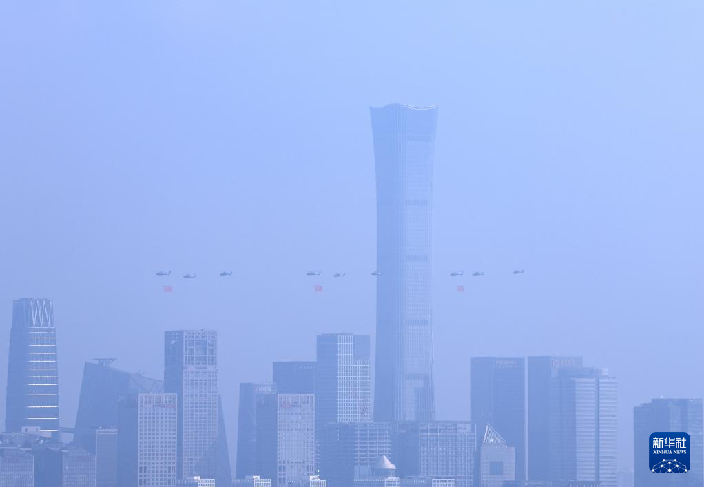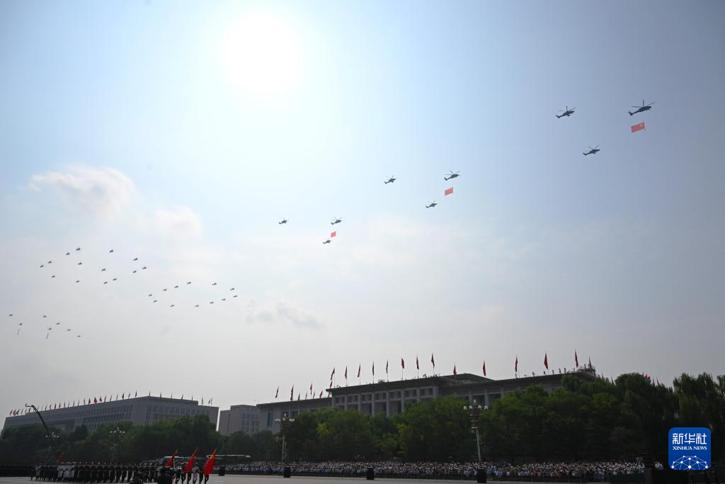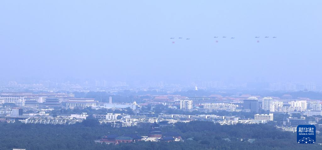 9月3日,紀念中國人民抗日戰爭暨世界反法西斯戰爭勝利80周年大會在北京隆重舉行。這是空中護旗梯隊通過天安門廣場。