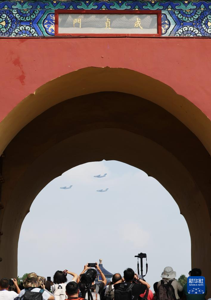 9月3日,紀念中國人民抗日戰爭暨世界反法西斯戰爭勝利80周年大會在北京隆重舉行。這是市民在北京天壇公園觀看運輸機梯隊。