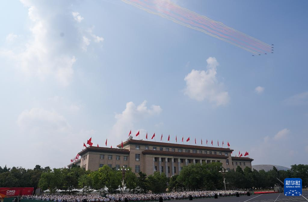 9月3日,紀念中國人民抗日戰爭暨世界反法西斯戰爭勝利80周年大會在北京隆重舉行。這是空中護旗梯隊通過天安門廣場。